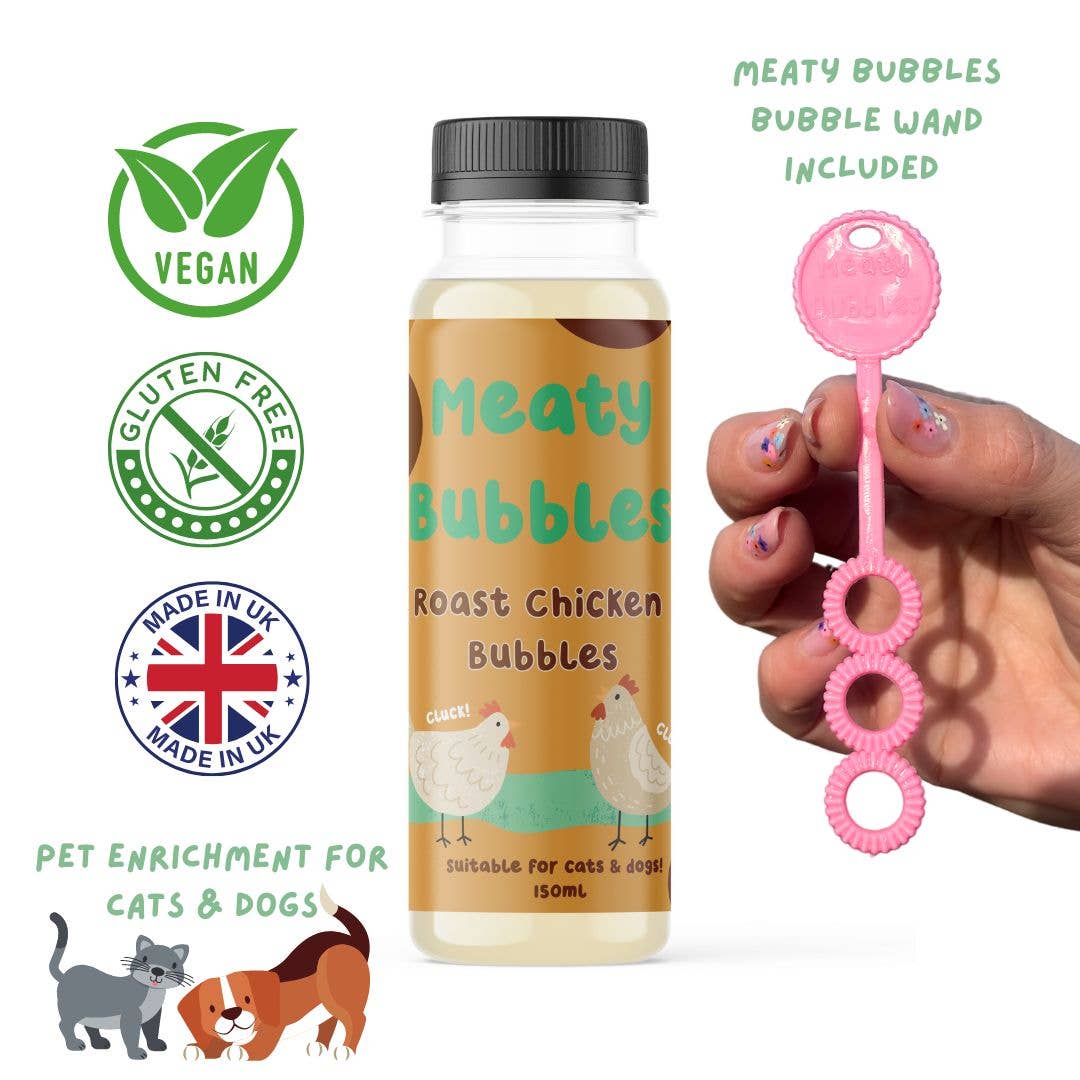 Prêt à être utilisé avec la baguette à bulles incluse ou dans une machine à bulles. ? Eviter tout contact avec les yeux. En cas d'irritation, arrêter l'utilisation. Les animaux de compagnie adorent les saveurs et les bulles de viande, comment ne pas aimer !