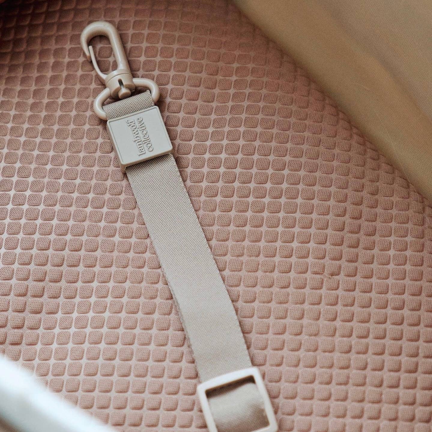Une ceinture de sécurité réglable est incluse pour attacher le support au collier/harnais. La fermeture zippée repose facilement sur les côtés intérieurs lorsqu'elle n'est pas utilisée. Le porte-bébé est doublé pour un entretien facile.